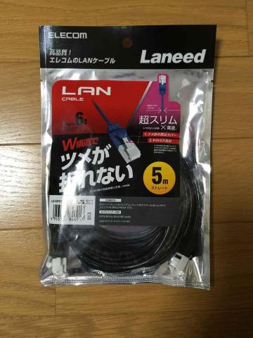 エレコムのLANケーブル。CAT6対応の5m。フラットではありませんが、スリムタイムのブラック色。