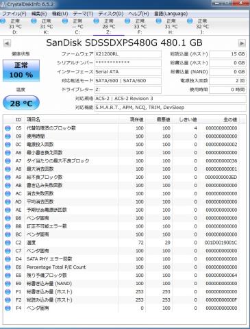 先ずはCrystal Disk InfoでS.M.A.R.Tを見てました。 ここでは2回になっていますがQCのためか1度使った形跡がありました。 作って即パケ詰め出荷ではないようです。