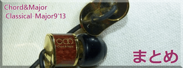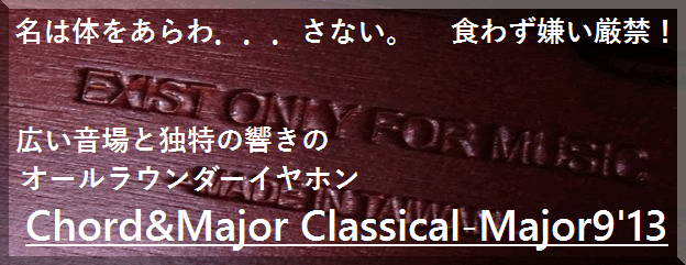 Major9’13の特徴としては音場が広く、ソコソコ上から下まで出るが、下は量はあるもややエッジが甘めの音、上は刺さるような成分ではないが煌びやかさがある。ちょっと独特の響きがあるのが、よいアクセントになる曲はいい感じにはまる。そして各楽器の分離はよい。これは添付されていた商品紹介のリーフに「Major9’13イヤホンは特に各楽器の表現力に着目してます」と書かれているので狙い通りなのだろう。