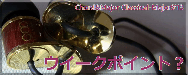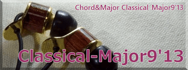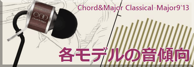 Chord&Majorのイヤホンの命名法は「ジャンル-一桁数字'(おそらく)発表年度下2桁」という形式(Major 9’13 (for Classic)のように「一桁数字 '発表年度下2桁(for ジャンル)」という表記法もある)。なぜか一桁数字は小さくなっていっており、本品が「9」、同時発売の「Rock」と「Jazz」がそれぞれ「8」と「7」。追加発売の「Ballad」が「6」で、そして今年(2015年)頭に追加されたのが「World-Major5'14」なので「5」。価格的には5≓6>9>7=8となっており、数字が小さいのが高いの(あるいはその逆)ではない。Chord&Majorは9つ(あるいは「0」を入れて10種?)しかイヤホンを出さないつもりなのだろうか。ただ今のところ高価格機種をマルチドライバ化するというような筐体形式の変更やサイズの差をつけることなくラインアップを拡充しており、同一筐体のイヤホンで「ジャンルごとの味付け」のレベルならば9~10種を造ることがむしろ難しいかもしれない。