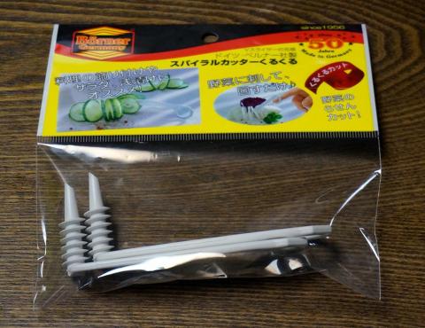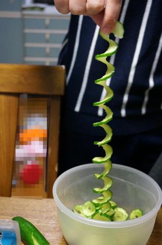 以前テレビを見ているときゅうりに細い鉄の棒を挿しそこに専用の刃物を引っかけクルクル回すと見事らせん状に切れていました。