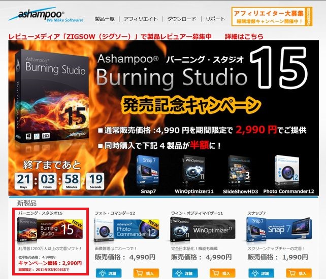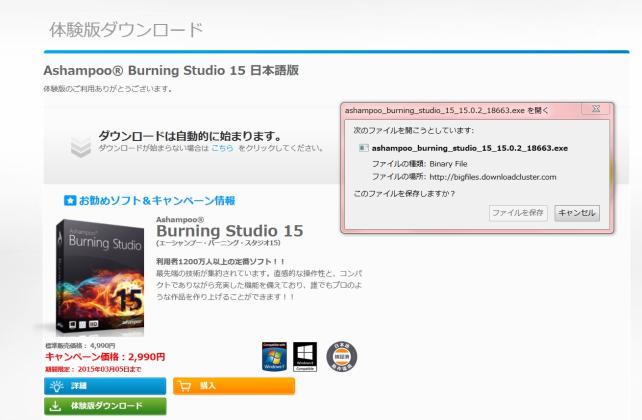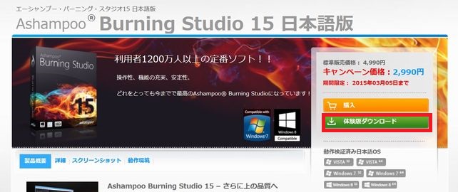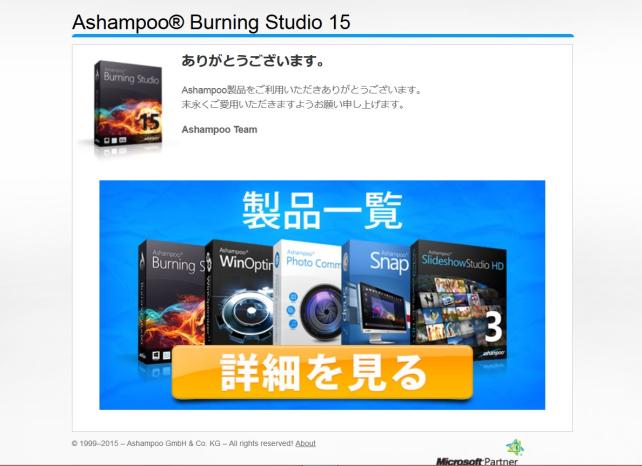 ashampooオフィシャルサイトへ行き、Ashampoo(R) Burning Studio 15 日本語版の体験版をダウンロードします。