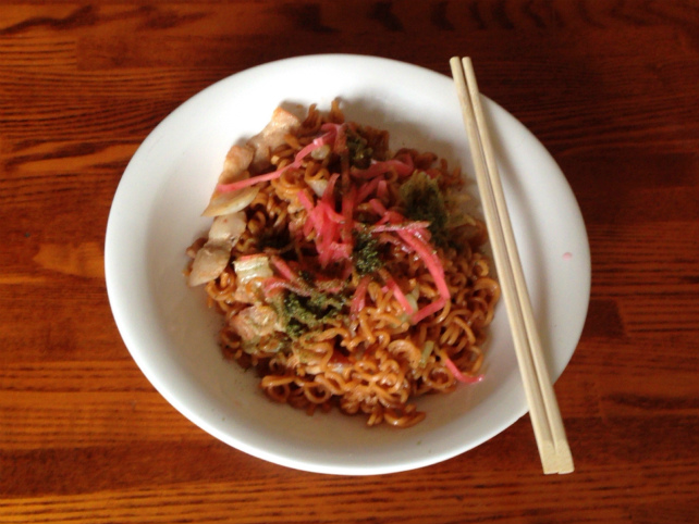 今回はモヤシが切れていたので、豚肉とキャベツ、仕上げには付属の「薬味?」と「紅生姜」。麺が「ボロボロ」になるところが却って美味しいのです…。