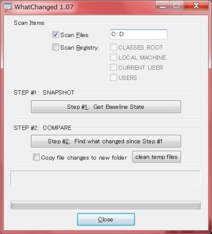 使い方はとても簡単で、最初にスキャンするレジストリやドライブを指定後、STEP 1ボタンで現在の状態のリストが作成されます。次に、STEP 2ボタンで1から変更があったレジストリやファイルのリストがSnapshot2というファイル名でプログラムと同一フォルダ内に保存されます。