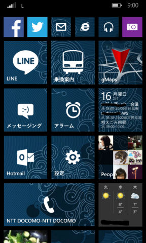 ツイッター、フェイスブック、Messenger,LINE、gMaps(なぜか、GoogleMapが動かないので。でもこれで事足ります)、乗換案内、Calendar for Business(標準のカレンダーが使いにくい)、マイクロソフトのファイルマネージャー、食べログ、簡単メモ、録音タイル、青空文庫くらいでしょうか。