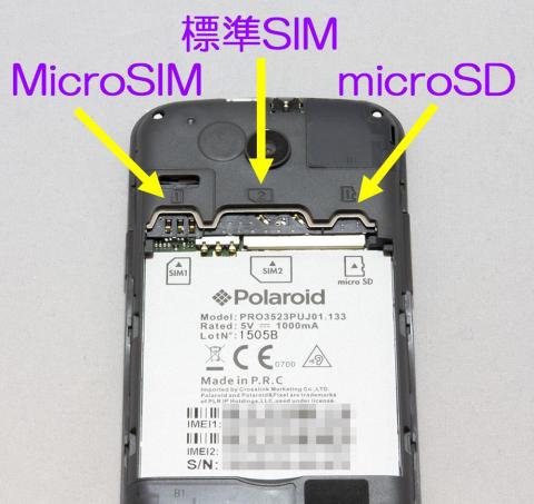 カバーを外した上の方にスロットがあり、左から「microSIMスロット」「標準SIMスロット」「microSDスロット」になります。