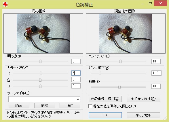 ・色調補正(R、G、B、明るさ、コントラスト、ガンマ補正、彩度)