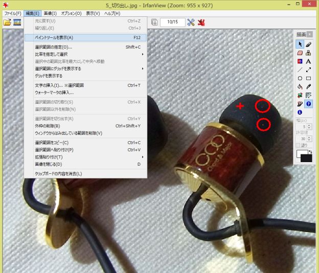 イヤチップに付いたゴミ(○)を近くで(+)サンプリングして近い色を拾って消す