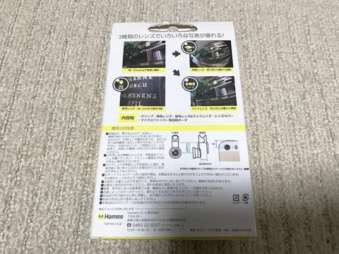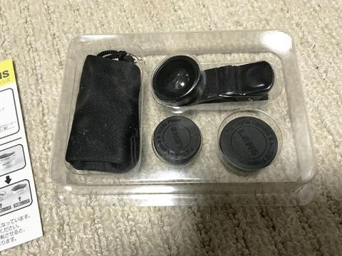 パッケージによると、パッケージに含まれるレンズは3種類で、魚眼、ワイド、接写という内訳のようです。クリップ式ですので、大抵のスマートフォンで問題なく使えるはずですが、公式サイト内でも注意されている通り、ケース付きのスマートフォンではケラレ等が発生する場合もあるということです。