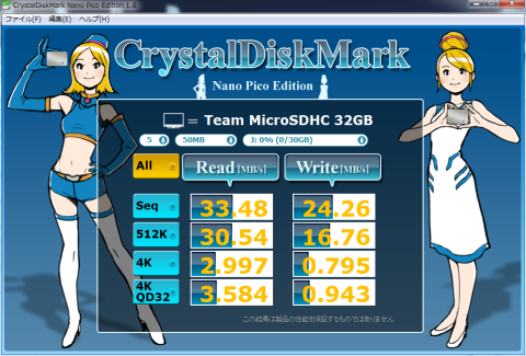 転送速度はシーケンシャルリード 33MB/s、シーケンシャルライト 24MB/sと予想以上に高速でした。リード・ライト共にTranscend製SDHC 32GBより高速です。
