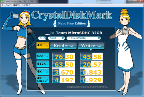 USB3.0対応 カードリーダー利用時のスコアはシーケンシャルリードは76MB/s、シーケンシャルライトは45MB/sと大幅に向上! これは所有しているSDカードの中で最も優秀なスコアです。