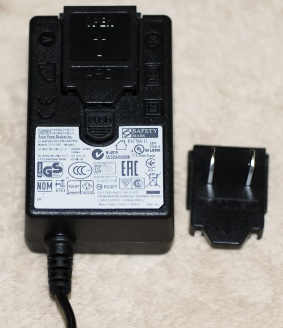 この電源アダプタの作りですが、コンセントからプラグを引き抜く際にPUSHボタンに指が触れて押されると、交換式プラグがコンセントに刺さったままアダプタと分離しがちなので要注意。