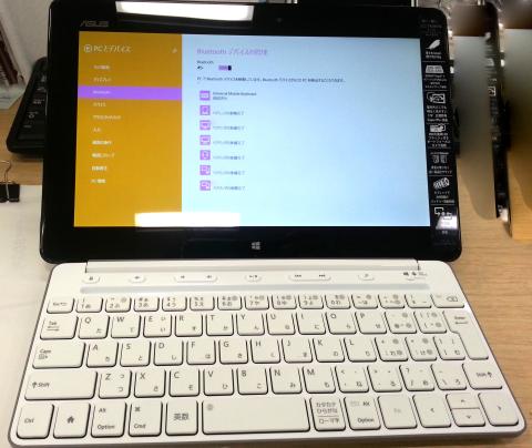タブレット部分は10インチほどあり、iPadとは違って本キーボードとぴったり一致とはいきませんが、なかなかのフィット感です。このASUSは、Windows8ならぬRTを積んでいるため若干の心配をしましたが、接続も例の6桁数字を入力するだけであっさり認識しました。考えてみれば本キーボードはMS製。仕様にもあり、当たり前といえば当たり前です。