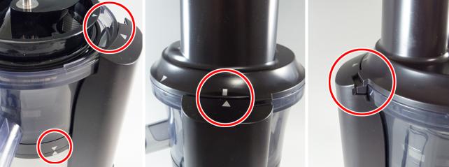 フタがついている方がジュースが出てくる出口、もう片方が搾り取られたカスが排出される出口となります。(右の写真はジュースアタッチメント装着時の写真)