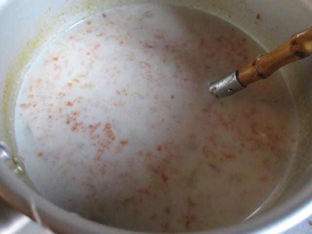 鍋に湯を沸かし、ニンジンとあらみじんに切った玉ねぎを投入。煮えたら、コンソメとコショウで味を調えてから、火を弱めて、牛乳を入れ、ひと煮立ちさせます。