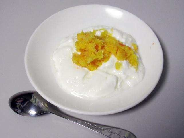さらに、料理をせずに絞りかすを有効利用できないものかと考えて、手近なヨーグルトであえてみることにしました…。