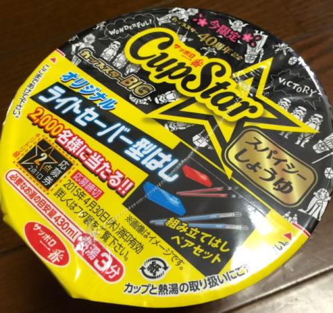 パッチコです。今回は日清と並んで長い歴史をもつサッポロ一番、カップスター40周年記念、スターウォーズスパイシーしょうゆです。