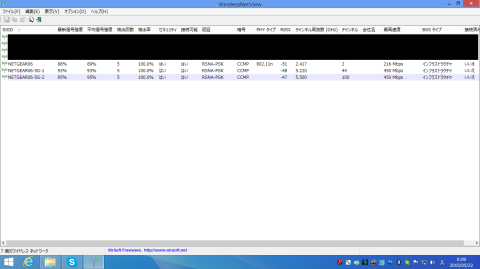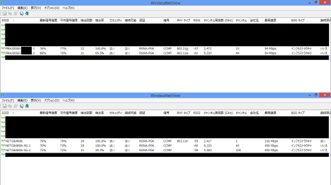 2.4GHz、5.22GHzともにPR-A300SEよりR8000の方が少し信号強度が強いようです。電波は周波数が高くなると減衰しやすくなるので、距離がある場合は2.4GHzの方が安定しそうです。