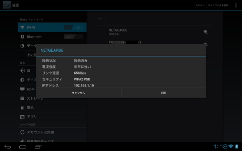 R8000から1メートルほどの距離のAndroidタブレットです。電波強度は強いから非常に強いになりました。
