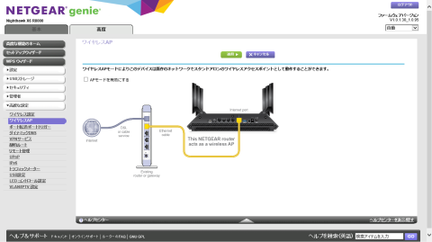 PR-A300SEに接続して使うので、NETGEAR genieのAPモードを使ってみました。APモードを使うと、R8000を別のルーターと同じローカルネットワークのアクセスポイント(AP)として動作するように設定できます。