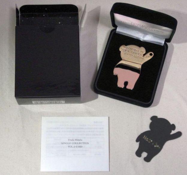 彼女が(特に後期に)アイコンとしていた「くまちゃん」がかたどられたUSBメモリ。宝石箱のようなケースに収められ、やや赤身の勝った金色のクマの首を取るとその端子が現れる。5000個限定で、そのシリアルは本体刻印ではなく、番号が書かれた紙は別につく形。USBメモリには、ヒカルの全アルバムのマスタリングを手がけたTed Jensenによるリマスタリングがされたハイレゾ音源(24bit / 96kHzのwavファイル)が収められる。もともとの担当エンジニアだけあって、一番古い音源は既に15年ほどを経過しているが大幅に手を入れるのではなく、また最近流行の音圧突っ込むチューニングもなく、「化粧直し」程度のものである事、元データが最新のハイレゾ対応環境で録音されたものではなく、アナログテープに関してはともかくデジタル録音に関しては量子化ビット数こそすべて24bitとはいうもののサンプリング周波数44.1kHzや48kHzのものもあり、元のCDに比べて「劇的に」変わったものではない。