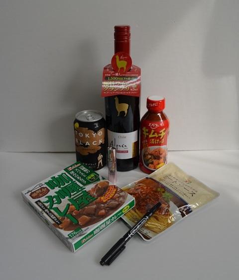 レトルトカレー、ミートソース、口紅、ワイン、油性ペン