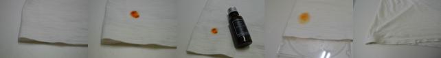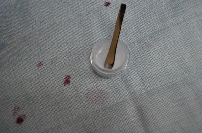NO.1を使用します。スパチュラでシミを動かし流水で洗い流します。NO.1で落ちにくい時には