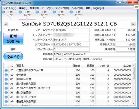 まずはCrystal Disk Infoの内容も掲載しておきます。