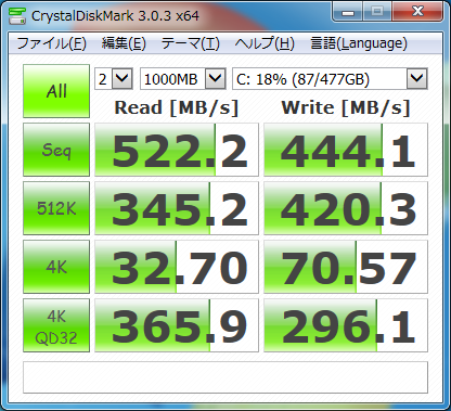 メーカーの製品情報によると、Read 520MB/s、Write 460MB/s、Random Read 96K、Random Write 80Kとなっています。書き込み側で公称値にやや足りない面もありますが、まずまず良好でしょう。
