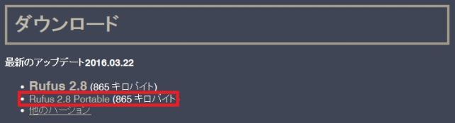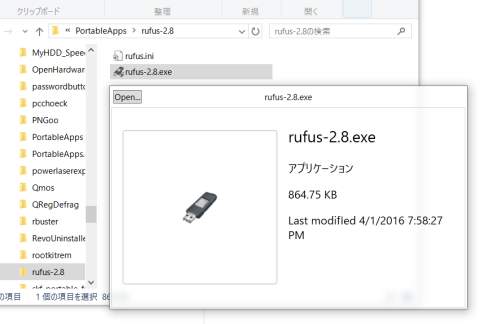 公式サイトからRufus 2.8 PortableをDLし、好きな所に保存。
