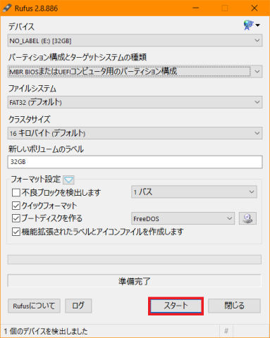 そして、Label、パーティション構成、ファイルシステム、クラスタサイズ、ボリュームサイズ、フォーマット設定などを指定して”スタート”をクリックすれば簡単に作成できます。