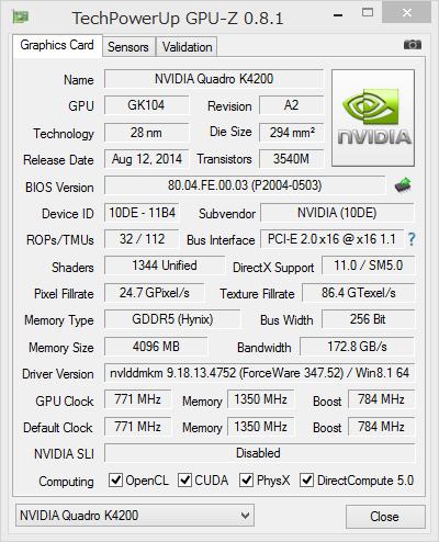 nVIDIAのQuadroで、5K表示が可能な現行品のGPUは、K2200,K4200,K5200,K6000とありますが、スペックと価格のバランスを考えると、K4200が妥当ではないかと考えました。