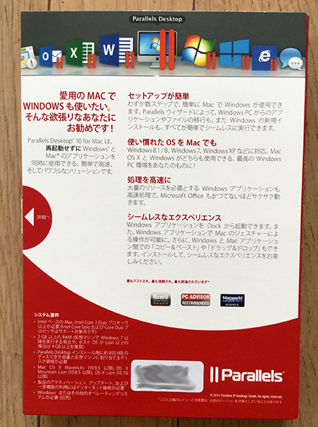 VMWareと比較検討しましたが、Parallelsの方がメジャーらしいのでこちらにしてみました。