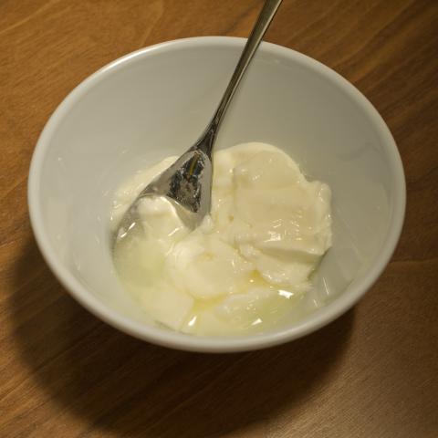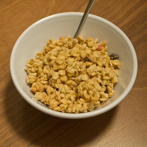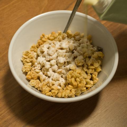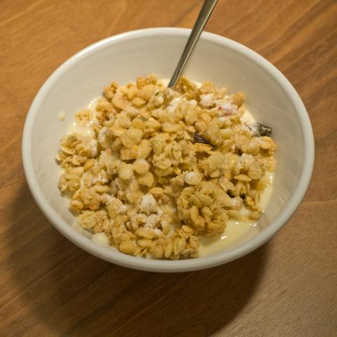 最近のフルグラの食べ方は、シリアルボールにヨーグルトを入れます。
