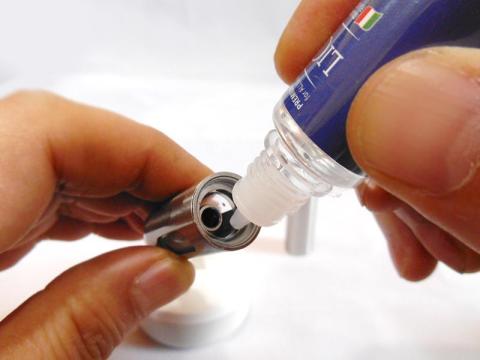 次にリキッドをタンク部分に入れます。間違って真ん中の穴に穴に入れないように!側面に流すように注入します。