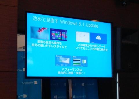日本マイクロソフトのOEM統括本部の嶋内氏によるWindows8.1の利点や8→8.1→8.1updateの進化に関するプレゼンが行われました。起動・終了が早いし、Oneドライブは便利。マイナーアップデートで顧客の情報を取り込んでいるとのこと。