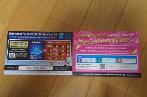DSP版Windows8.1を使っているということで、キャンペーンのシリアルコードが2つ同封されていました。1つはファンタシースターオンライン2の武器がもらえるもの。もう1つは、キャッシュバンク。2000円のキャッシュバックがいただけるそうです。