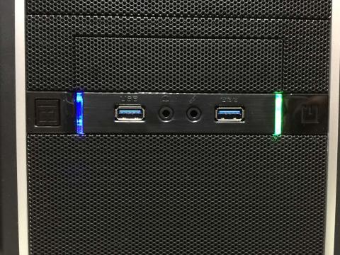 外部3.5インチベイが1つあり、その下の各種アクセスポートがあります。電源ランプが珍しくグリーンのLEDでした。その他、USB3.0が2ポート、ヘッドホン、マイク端子も装備しています。