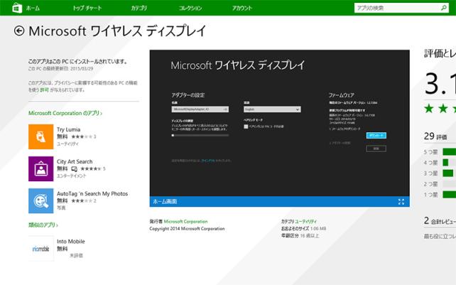 最初に、Windowsストアから、Microsoftワイヤレス ディスプレイ アダプター アプリケーションをダウンロードしてPCにインストールします。