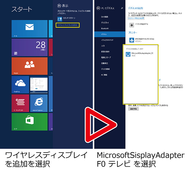 次に、"ワイヤレスディスプレイを追加"(黄色枠)を選択し、スキャンして表示される、”MicrosoftDisplayAdapter_F0”を選択します。