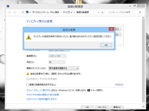 できれば1280x800の画面の複製にしたかったのですが、設定を変更しようとすると、怒られてしまいます。