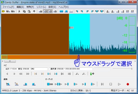 波形部分をマウスドラッグにて3秒ほど指定します。