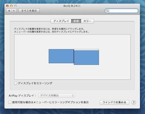 ちょっと惜しいのが、Mac的にはモニタを接続しているという認識があるようで、HDMI接続とmDP接続でマルチモニタにすると、システム環境設定ではちゃんとマルチモニタになっています。