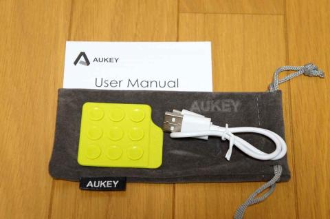充電用のMicroUSB-USBケーブルと、固定用のパッド、Aukeyではお馴染みの携帯用ポーチが付属します。このポーチが良いんですよね。キレイなモバイルバッテリーも、裸で持ち歩くと傷が入りますが、このポーチがあれば、傷を防げます。