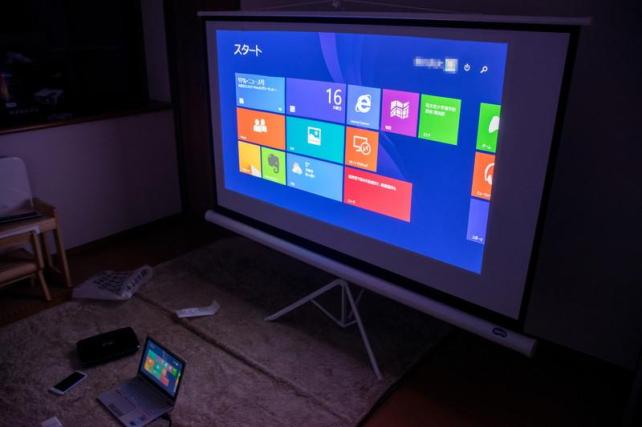 HD動画もバッチリです。昔のプロジェクターだと、動画系の投影はやはり輪郭がぼやけたり、残像が残ったりして苦手な分野だったと思うのですが、大きな液晶テレビを見ているかのようでした。良く見るとPCの液晶よりも輝度が高いので見やすいですね。