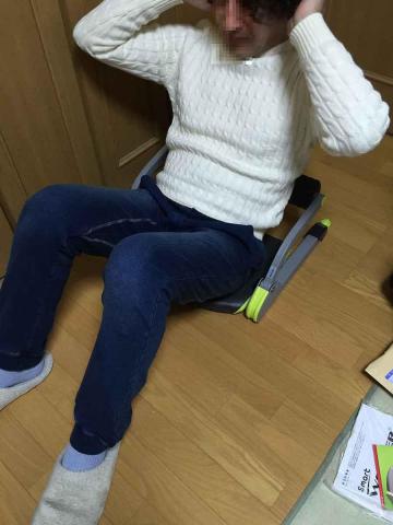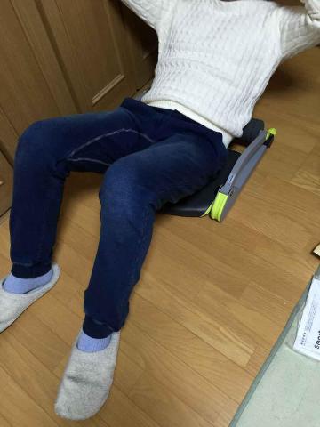 従来機のように、脚を引っ掛けるところがないので、脚を曲げて行います。
