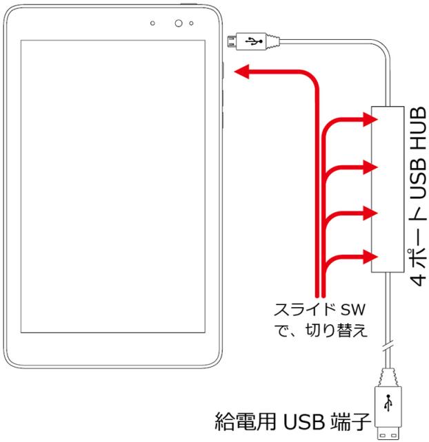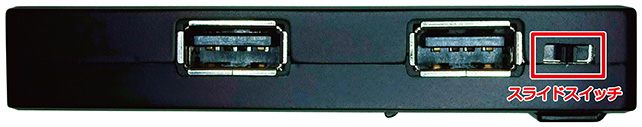 しかも、USB HUBにはスライドスイッチが付いていて、給電用USB端子からの電気を、PC本体充電用にすることもできるし、USB HUBに接続したUSBデバイスに給電することもできます。
