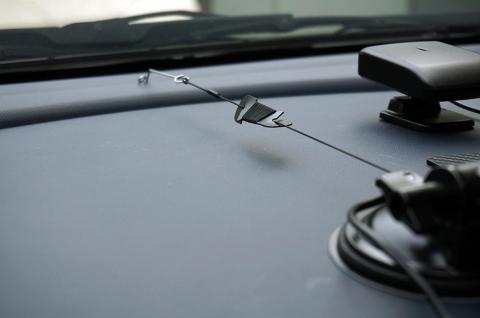 金具に紐を通し、紐を吸着盤ベースにからめ、金具はフロントガラス下の送風口(デフロスター)に取り付けます。
