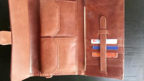カード入れに紐でロックをできるような仕組みがあり、外観も通常であればボタンで済ませしまう開閉をベルト式にしました。高級感があります。