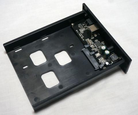 2.5インチ用のネジ穴とネジも付属しているのは少し珍しい。まあセルフパワーで図体のでかいこのケースでわざわざ2.5インチドライブを使う人がいるのかは怪しいが、この状態なら貯金箱機能と併用できるが、特に間仕切りとかないのでコインが内部で暴れまわるぞ。というかSSDつけなくても基盤までコイン転がってくぞこの構造。